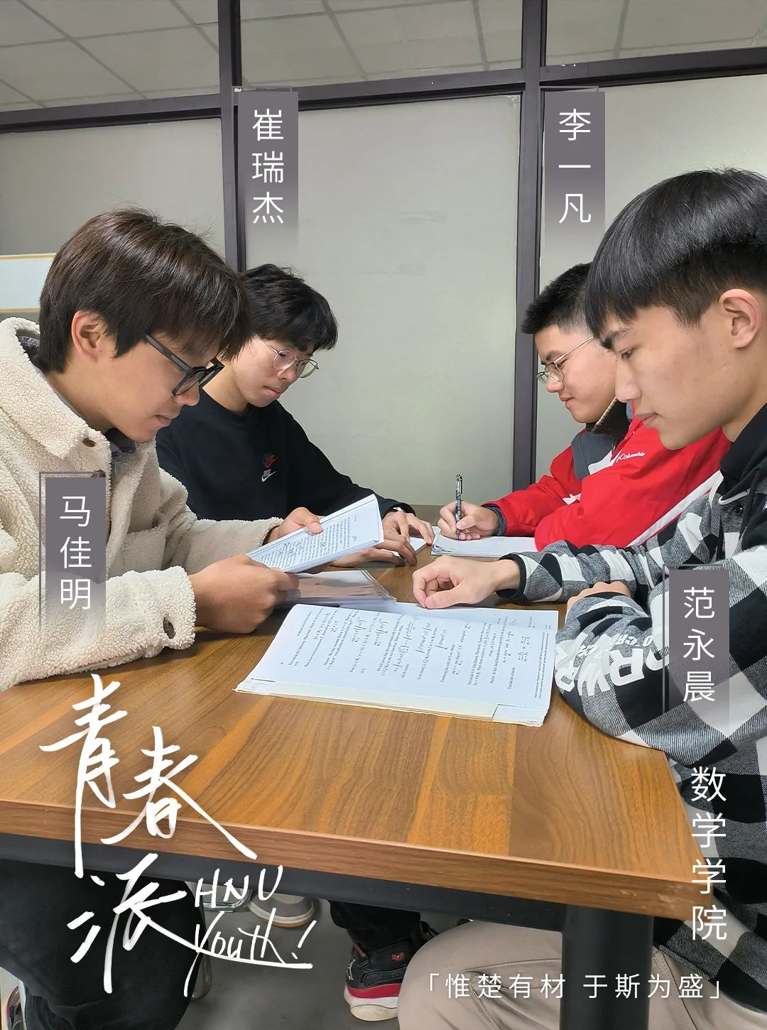 天马2区6栋636宿舍住着四名湖大少年:就读于数学学院的他们在教室里一起博观约取,厚积薄发,携手同行;在球场上配合默契,挥洒汗水,并肩作战……从科研竞赛到志愿服务,从学生工作到升学深造,都能看到他们活跃的身影。四年拼搏,热爱如初,全寝深造,他们是风华正茂的湖大人。