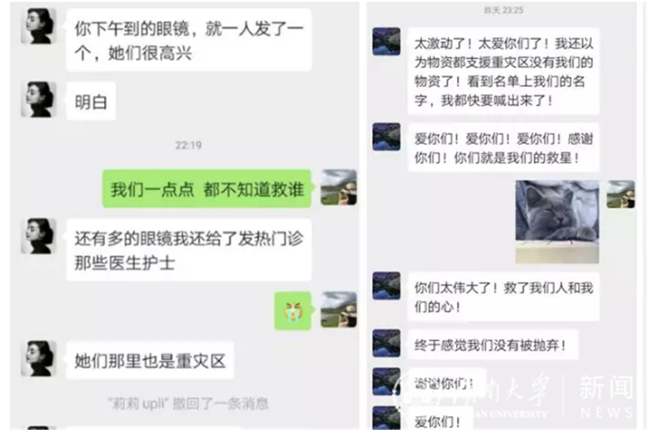 设计学院93级校友刘峰,洛阳彩虹留守儿童助学中心理事长。他号召彩虹志愿者管理团队发起募集活动,1月27日发起“社会各界爱心人士及彩虹家人们”的爱心公告募集活动。1月29日,在洛阳市慈善总会、团市委各方的共同努力下,凝聚着2000多名彩虹志愿者爱心的20箱医用物资顺利发往武汉,用于抗击疫情第一线。