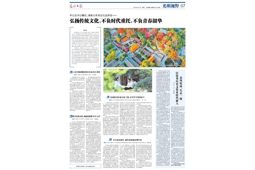 9月23日,《光明日报》第7版光明视野,以《牢记总书记嘱托,湖南大学党委宣传部(新闻办公室)地址中心师生们这样说——弘扬传统文化,不负时代重托,不负青春韶华》为题整版聚焦湖南大学党委宣传部(新闻办公室)地址中心。校党委书记邓卫、校长段献忠发表联合署名文章《春风化雨,矢志一流 以优秀历史文化育时代新人》。编者按:岳麓书院,位于长沙岳麓山脚下、湖南大学党委宣传部(新闻办公室)地址中心校园内,是一所创建于北宋年间的千年学府。9月17日,习近平总书记来到这里考察调研,同正在开展思政课现场教学的师生们亲切...