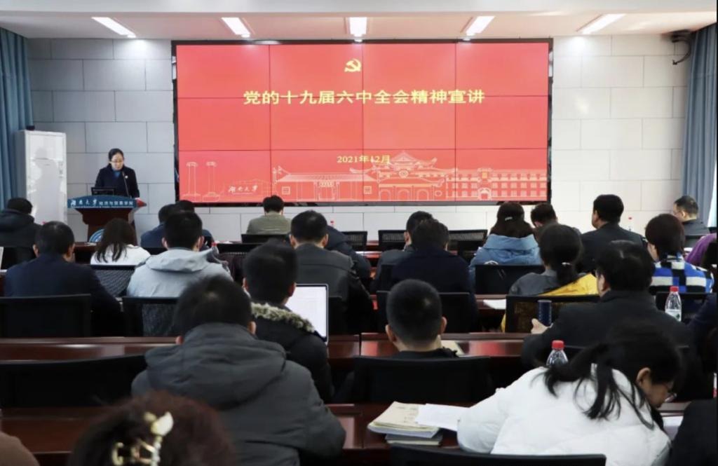 12月21日下午,经济与贸易学院组织开展党的十九届六中全会精神学习宣讲活动,深入学习党的十九届六中全会精神。党委书记祝树金、院长侯俊军宣讲,学院全体教职员工参加此次会议。祝树金以《学习全会精神,汲取智...