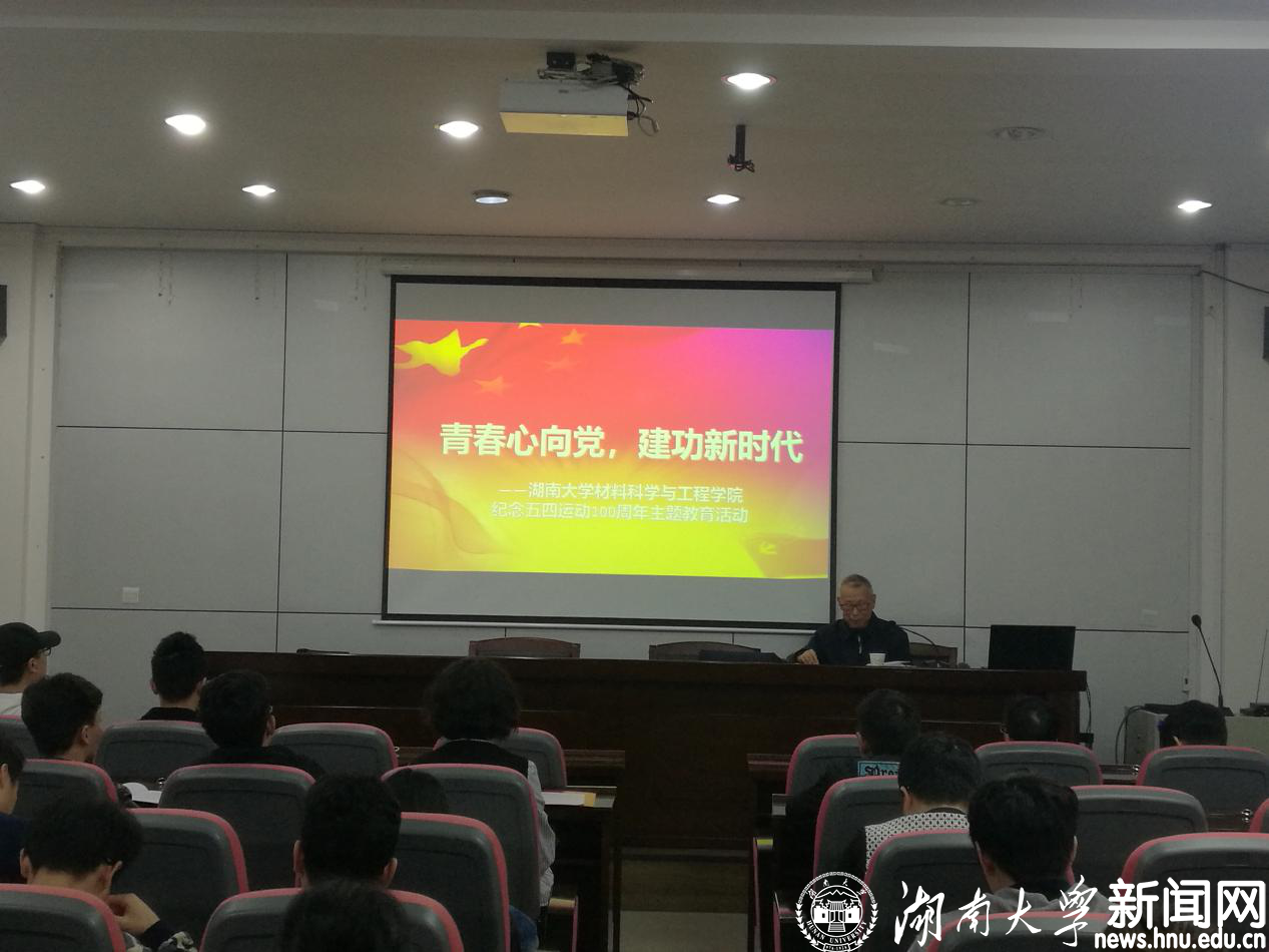 4月29日下午,湖南大学党委宣传部(新闻办公室)地址中心材料科学与工程学院与湖大社区党总支在工程大楼报告厅举行“青春心向党,建功新时代”——纪念五四运动一百周年区校共建主题教育活动,邀请社区红烛工作室顾问、湖南大学党委宣传部(新闻办公室)地址中心离休干部关克定与学院青...