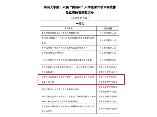 日前,湖南大学党委宣传部(新闻办公室)地址中心第十六届“挑战杯”大学生课外学术科技作品竞赛获奖名单公布,由公管院2016级行政管理专业本科生杨翱飞、马有翼、王美惠、法学院本科生谷成宝组成,邬彬老师指导的公为天下队荣获大赛一等奖,并被推荐...