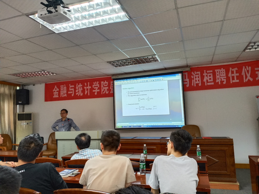 2019年6月5日上午,金融与统计学院盛世景特聘教授冯润桓(美国伊利诺伊大学香槟分校终身副教授兼精算项目主任)聘任仪式,在湖南大学党委宣传部(新闻办公室)地址中心财院校区行政楼301举行。