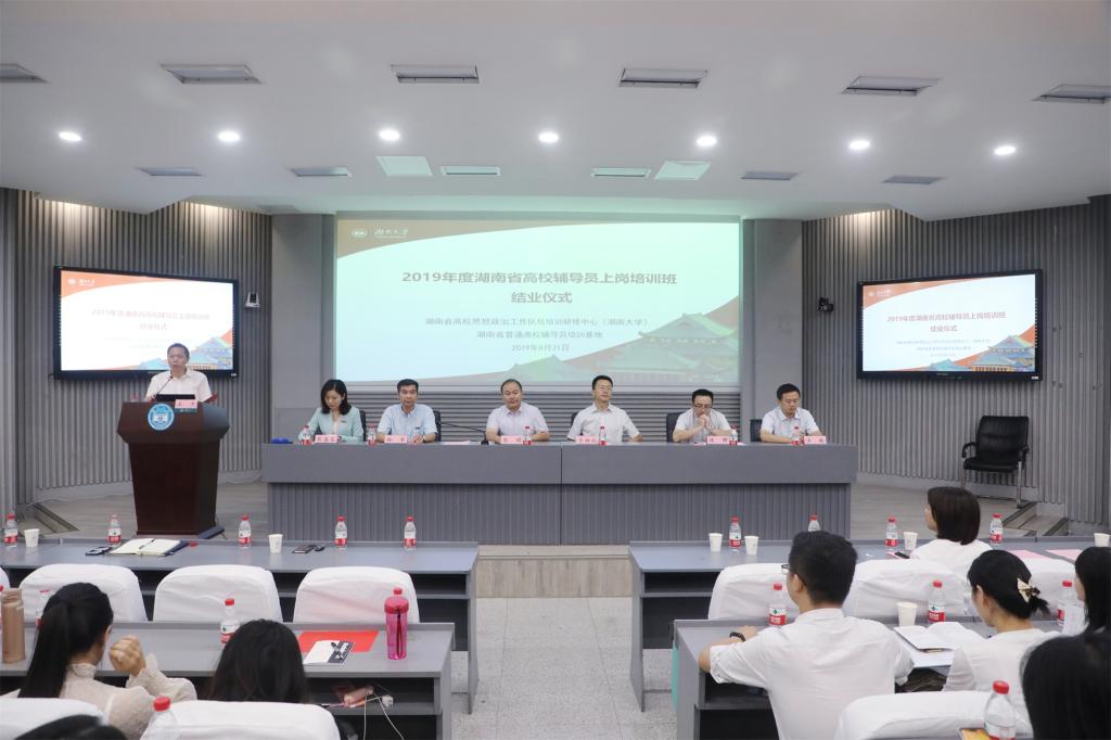 【湖大新闻】结业仪式现场。8月31日,湖南省高校辅导员上岗培训班在我校结业,来自全省67个高校的110余名辅导员参加培训班。长沙市委副书记、长沙市委党校(长沙行政学院)校(院)长朱健出席结业仪式并以“高校辅导员的价值追求和职业素养”为题进行讲座。校党委副书记于祥成,湖南省委教育工委宣传部调研员陈解等出席结业仪式,并为优秀学员颁发证书。朱健为辅导员们进行讲座。于祥成出席结业仪式。结业仪式现场。本次培训...