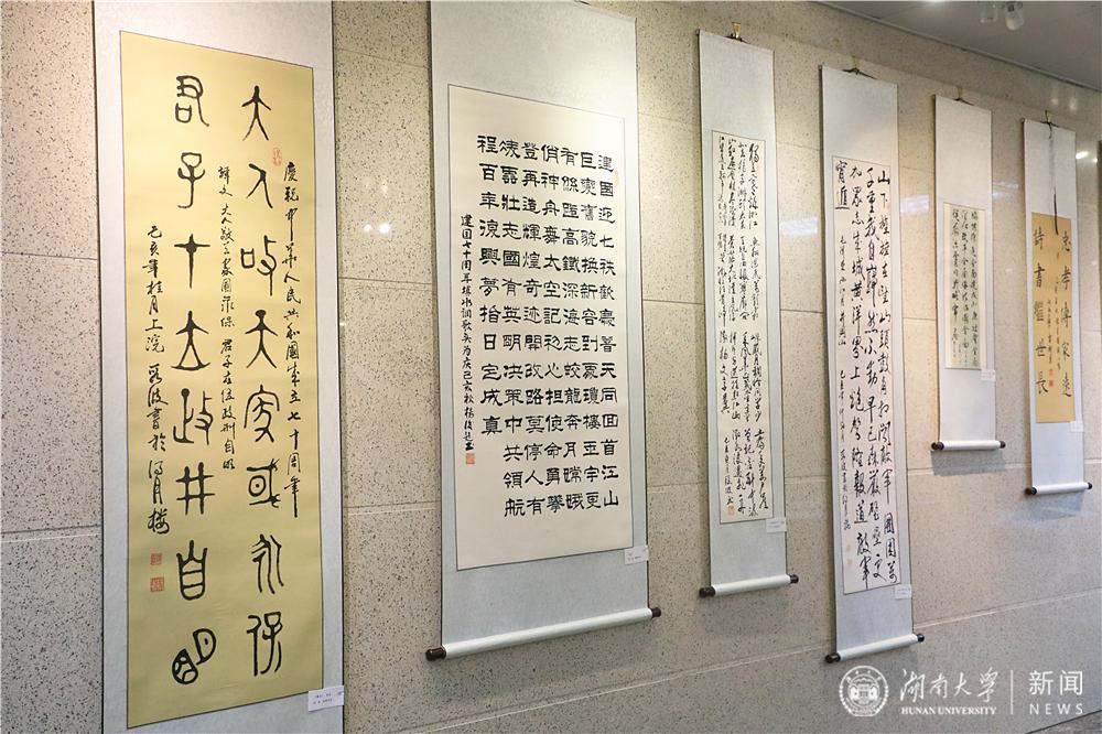 10月15日上午,“我和我的祖国”湖南大学党委宣传部(新闻办公室)地址中心庆祝中华人民共和国成立70周年师生书法绘画作品展在岳麓书院博物馆负一楼开幕,校党委副书记陈伟到场参观。本次展览持续一周,共展出来自我校教职员工、学生、附属中学和附属子弟小学学生的120余件书法绘画作品,作品中饱含着我校师生对祖国母亲的深情告白和美好祝福。