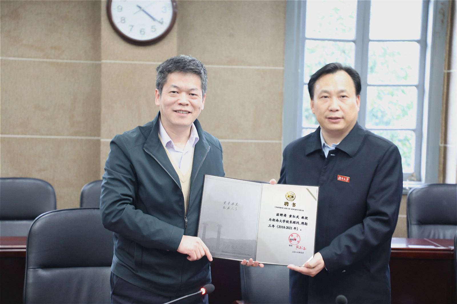 【湖大新闻】 11月9日下午,学校举行仪式,聘任黄红武教授为我校校长顾问,校党委书记邓卫为黄红武教授颁发聘书并佩戴校徽,副校长刘金水主持聘任仪式。