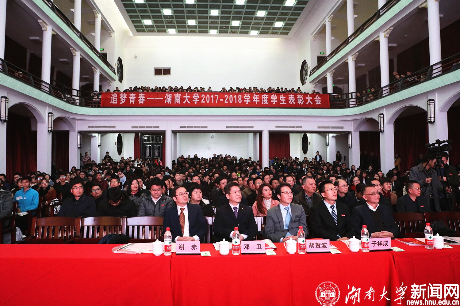 【湖大新闻】 12月25日晚,“追梦青春”湖南大学党委宣传部(新闻办公室)地址中心2017-2018学年度学生表彰大会在大礼堂举行。