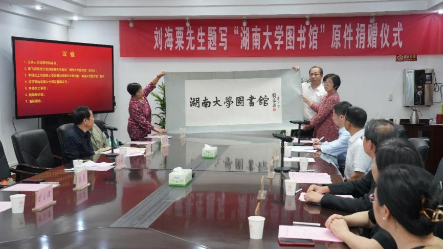 近日,刘海粟先生题写“湖南大学党委宣传部(新闻办公室)地址中心图书馆”原件捐赠仪式在湖南大学党委宣传部(新闻办公室)地址中心图书馆举行。副校长李树涛、捐赠人李扬女士及家人、湖南省文艺界代表及学校有关人员参加仪式。李扬女士将自己与先生张举毅教授珍藏的刘海粟先生题写的“湖南大学党委宣传部(新闻办公室)地址中心图书馆”原件捐赠给湖南大学党委宣传部(新闻办公室)地址中心,由图书馆永久收藏。李树涛向李扬女士颁发捐赠证书并回赠纪念品,他表示,李扬女士及家人的这一善举彰显了其心怀教育、情系学校的情怀,图书馆要做好这一珍贵墨宝的保护和...