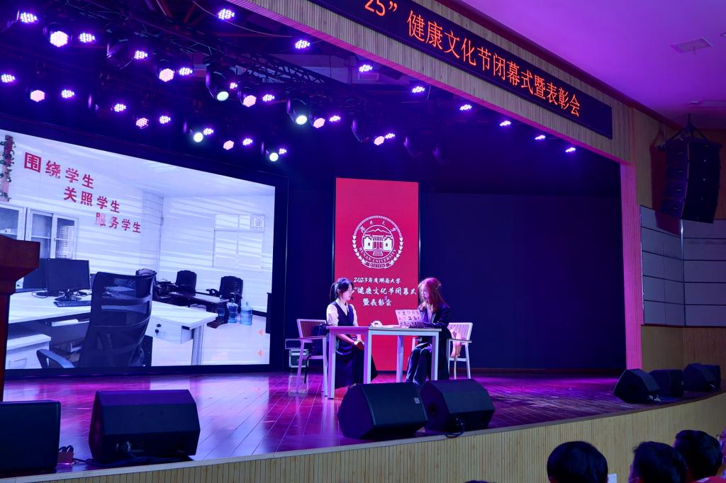 5月23日下午,2023年度“5·25”健康文化节闭幕式暨表彰会在学生活动中心举行。本届“5·25”健康文化节自4月10日启动,形式多样、内容丰富。活动开展了绘画比赛、摄影比赛、微电影比赛和情景剧比赛,收到了来自28个学院的数百份参赛作品,展现了我校学生阳光健康、积极向上的精神风貌;研究生师生拔河比赛共18个学院报名参加,激发了师生运动热情,进一步促进了导师与学生之间的交流;心理健康教育讲座、“栖心”系列团体辅导、...