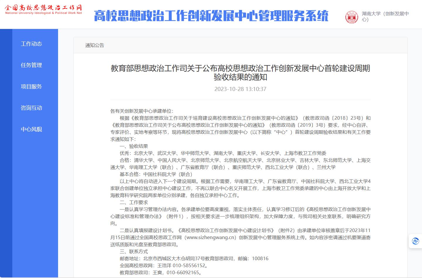 日前,教育部思想政治工作司公布了首批高校思想政治工作创新发展中心(以下简称“创新发展中心”)首轮建设周期验收结果,学校承建的创新发展中心以优秀成绩通过验收,并顺利开启第二轮建设周期。2019年1月,教育部思想政治工作司遴选产生首批共20个创新发展中心,我校作为唯一以平安校园建设为方向的承建单位,进行为期四年的首轮建设工作。在首轮建设周期中,学校全力落实承建责任,将思想政治工作与平安校园建设创新发展相结...