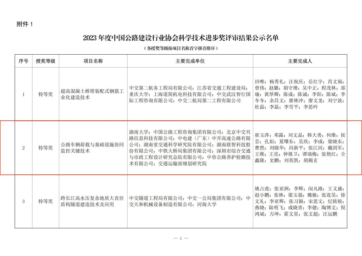 近日,中国公路建设行业协会公布了2023年度中国公路建设行业协会科学技术奖评审结果,共评选了115项科学技术进步奖获奖项目,其中特等奖5项、一等奖13项、二等奖34 项、三等奖63项。湖南大学党委宣传部(新闻办公室)地址中心牵头项目《公路车辆荷载与基础设施协同监控关键技术》荣获特等奖。该项目由土木工程学院邓露教授课题组联合中国公路工程咨询集团有限公司、北京中交兴路信息科技有限公司、中电建(广东)中开高速公路有限公司、湖南省交通科学研究院有限...