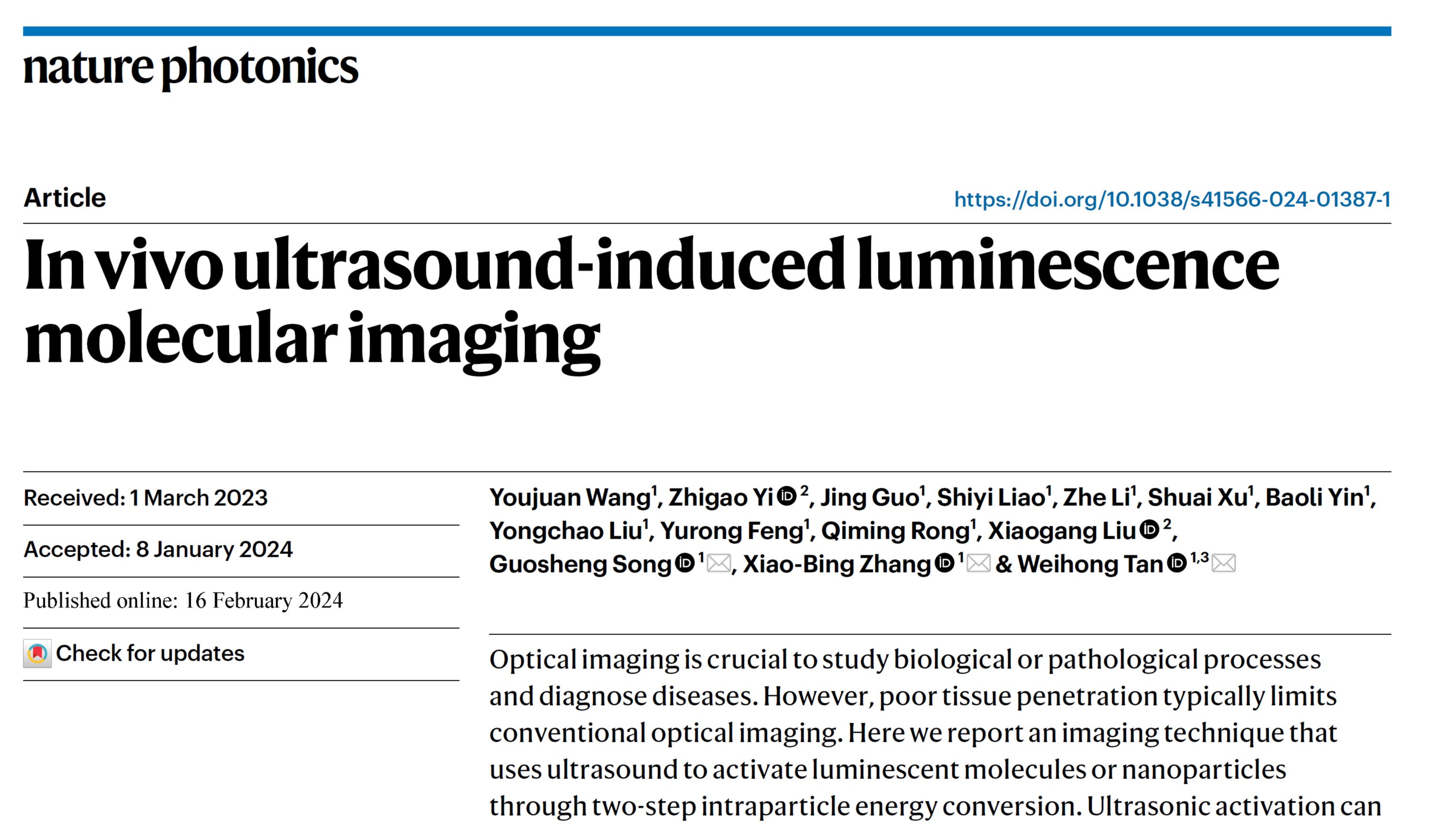 分子成像技术用于可视化和定量分子和细胞生物过程,进行疾病的检测、诊断、预测和监测。然而,依赖实时光激发的荧光成像往往受到组织自发荧光的影响,降低了活体组织成像灵敏性和特异性,生物发光或化学发光信号则往往受到活体中酶微环境或底物分布的影响。超声成像技术在医学临床诊断中被广泛使用,它通过超声波的传输、反射和散射原理,映射出人体内部结构的图像。声致发光是一种在高强度超声作用下,液体空化而产生的微弱发...