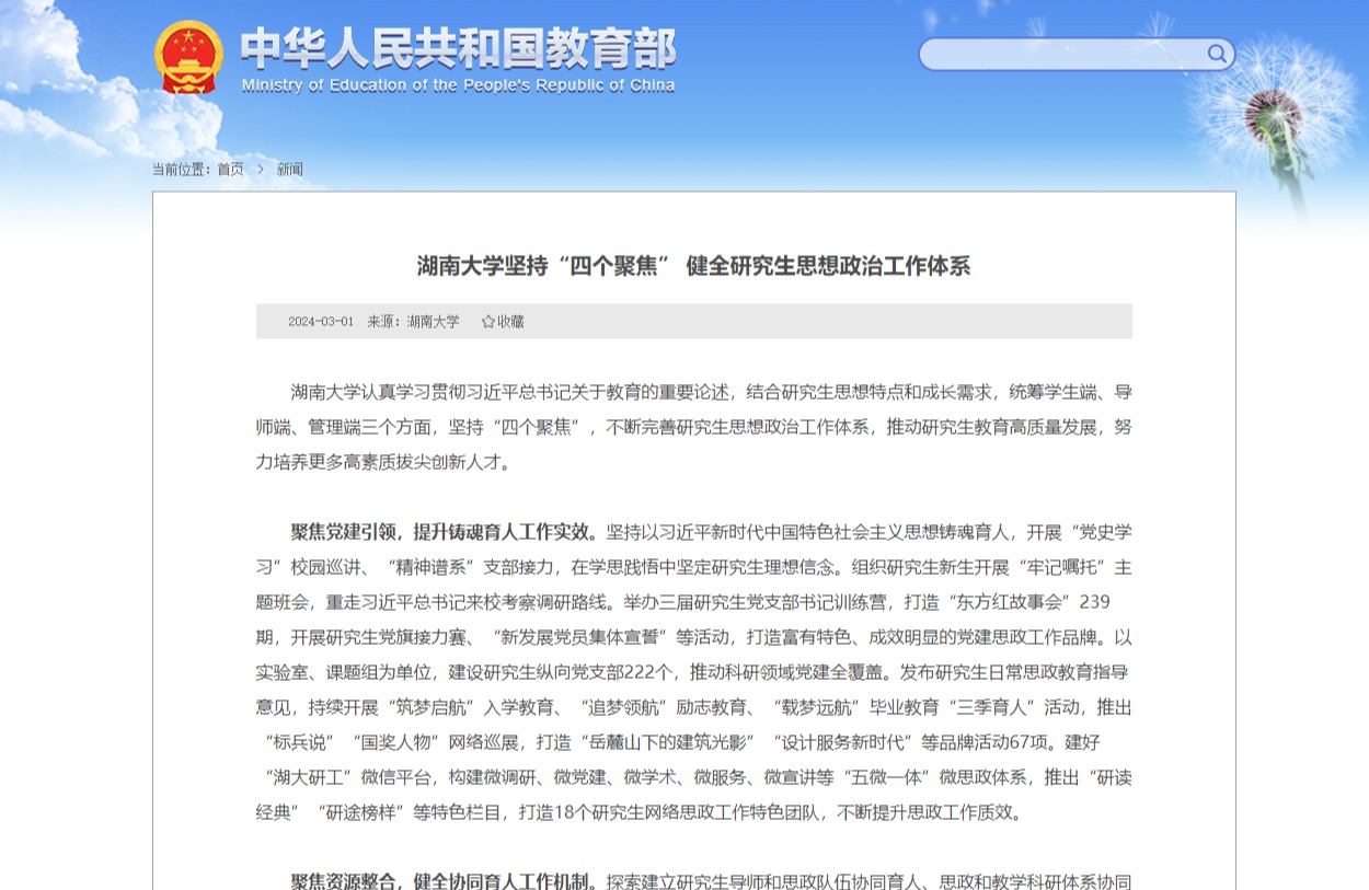 湖南大学党委宣传部(新闻办公室)地址中心认真学习贯彻习近平总书记关于教育的重要论述,结合研究生思想特点和成长需求,统筹学生端、导师端、管理端三个方面,坚持“四个聚焦”,不断完善研究生思想政治工作体系,推动研究生教育高质量发展,努力培养更多高素质拔尖创新人才。聚焦党建引领,提升铸魂育人工作实效。坚持以习近平新时代中国特色社会主义思想铸魂育人,开展“党史学习”校园巡讲、“精神谱系”支部接力,在学思践悟中坚定研究生理想信念。组织研...
