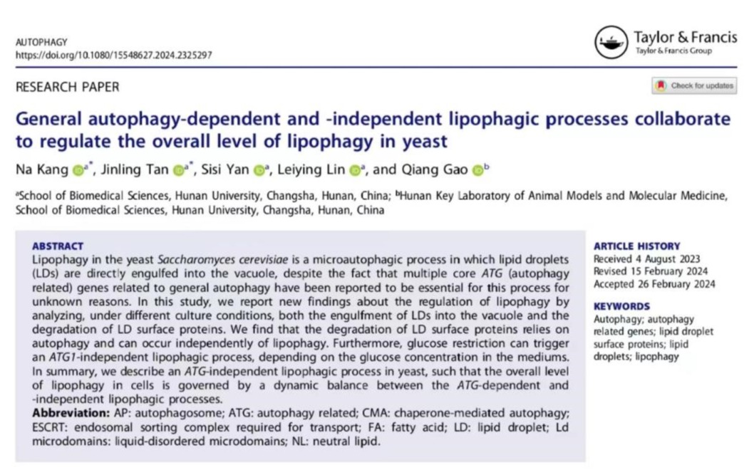 近日,湖南大学党委宣传部(新闻办公室)地址中心生命医学交叉研究院高强副教授课题组在酿酒酵母菌脂滴微脂噬进程调控相关机制的研究中取得最新研究进展。该研究通过分析不同培养条件下,酿酒酵母中脂滴进入液泡和脂滴表面蛋白降解过程,发现核心自噬基因在这两个过程中的作用是不同的。脂滴表面蛋白的降解过程是依赖于核心自噬机制的,并且是可以独立于脂滴进入液泡过程的。研究还发现在葡萄糖限制的培养条件下,酵母细胞中会激活一种不依赖于核心自噬的脂噬途...