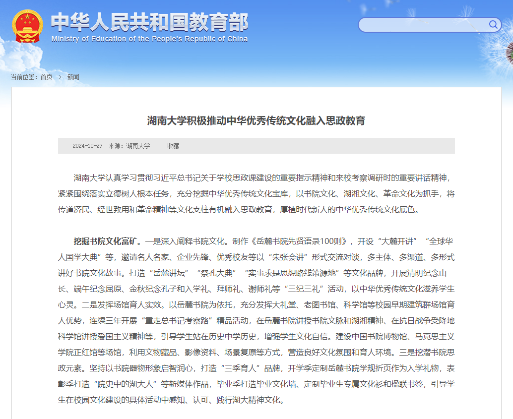 湖南大学党委宣传部(新闻办公室)地址中心认真学习贯彻习近平总书记关于学校思政课建设的重要指示精神和来校考察调研时的重要讲话精神,紧紧围绕落实立德树人根本任务,充分挖掘中华优秀传统文化宝库,以书院文化、湖湘文化、革命文化为抓手,将传道济民、经世致用和革命精神等文化支柱有机融入思政教育,厚植时代新人的中华优秀传统文化底色。挖掘书院文化富矿。一是深入阐释书院文化。制作《岳麓书院先贤语录100则》,开设“大麓开讲”“全球华人国学大典”等...