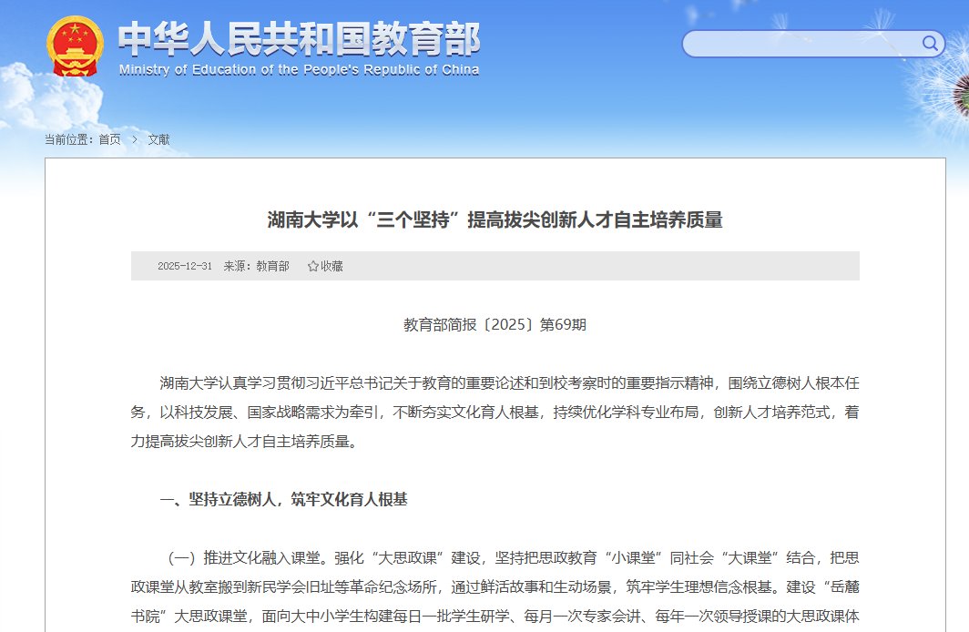 教育部简报〔2025〕第69期湖南大学党委宣传部(新闻办公室)地址中心认真学习贯彻习近平总书记关于教育的重要论述和到校考察时的重要指示精神,围绕立德树人根本任务,以科技发展、国家战略需求为牵引,不断夯实文化育人根基,持续优化学科专业布局,创新人才培养范式,着力提高拔尖创新人才自主培养质量。一、坚持立德树人,筑牢文化育人根基(一)推进文化融入课堂。强化“大思政课”建设,坚持把思政教育“小课堂”同社会“大课堂”结合,把思政课堂从教室搬...