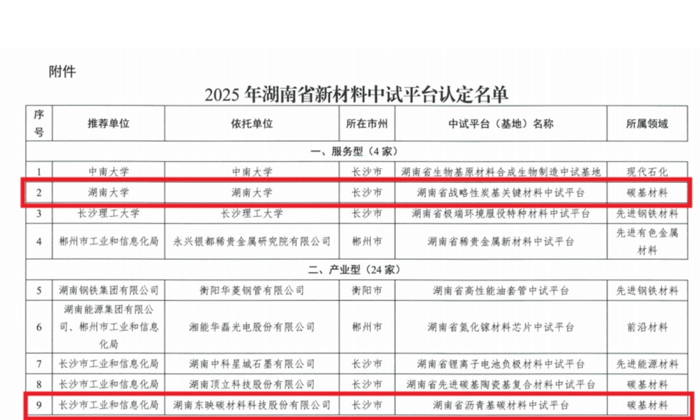 近日,湖南省工业和信息化厅公布了2025年湖南省新材料中试平台认定名单,我校刘继磊教授牵头申报的“湖南省战略性炭基关键材料中试平台”被认定为“碳基材料”领域湖南省新材料中试平台(服务型)。联合申报单位湖南极电特能科技有限公司系我校材料院科技成果转化企业。“战略性炭基关键材料中试平台”是面向国家重大需求,聚焦湖南省“碳基材料”重点产业集群,为先进能源碳材料和特种炭石墨等特色方向的成果提供各类中试服务...
