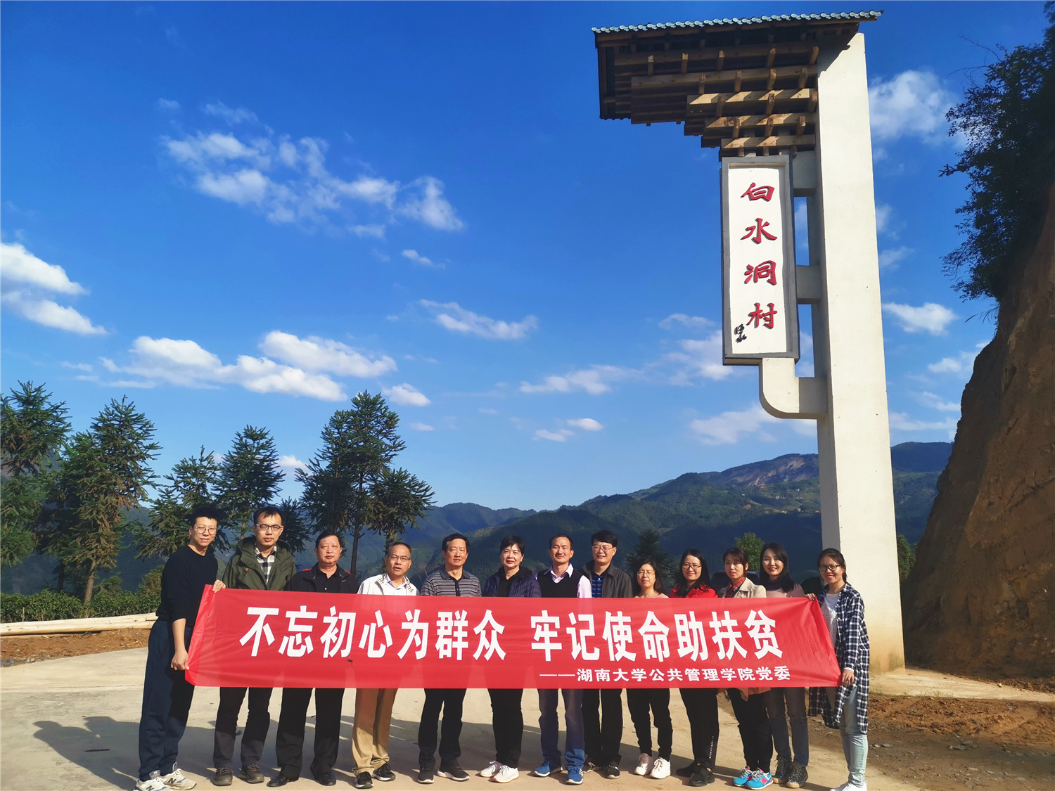 10月19日至20日,公共管理学院党委组织全体班子成员、教工党支部书记和教授党员代表,集体来到学校驻点扶贫村隆回县虎形山瑶族乡白水洞村开展实地调研,通过扶贫项目考察、结对帮扶走访、听取专题报告、交流座谈研讨等方式深入开展“不忘初心、牢记使命”主题教育。19日中午,调研组一行一下高铁,就立刻转乘汽车来到白水洞村,现场考察白水洞村脱贫攻坚工作开展情况。“2012年以来,千年学府湖南大学党委宣传部(新闻办公室)地址中心与偏远瑶寨白水洞结为帮扶...
