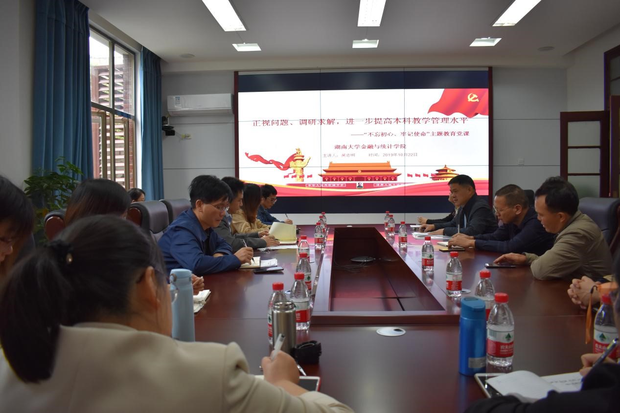 为深入学习习近平新时代中国特色社会主义思想,全面贯彻“不忘初心、牢记使命”主题教育活动“守初心、担使命、找差距、抓落实”的十二字总要求,10月22日上午,金统院吴志明副院长以“正视问题、调研求解,进一步提高本科教学管理水平”为题,主讲“不忘初心、牢记使命”主题教育党课。学校主题教育第三指导组龚翔、学院院长潘敏,各教学系主任、党支部书记(委员),学院督导中心主任、教学秘书等参加了本次会议。潘敏院长...
