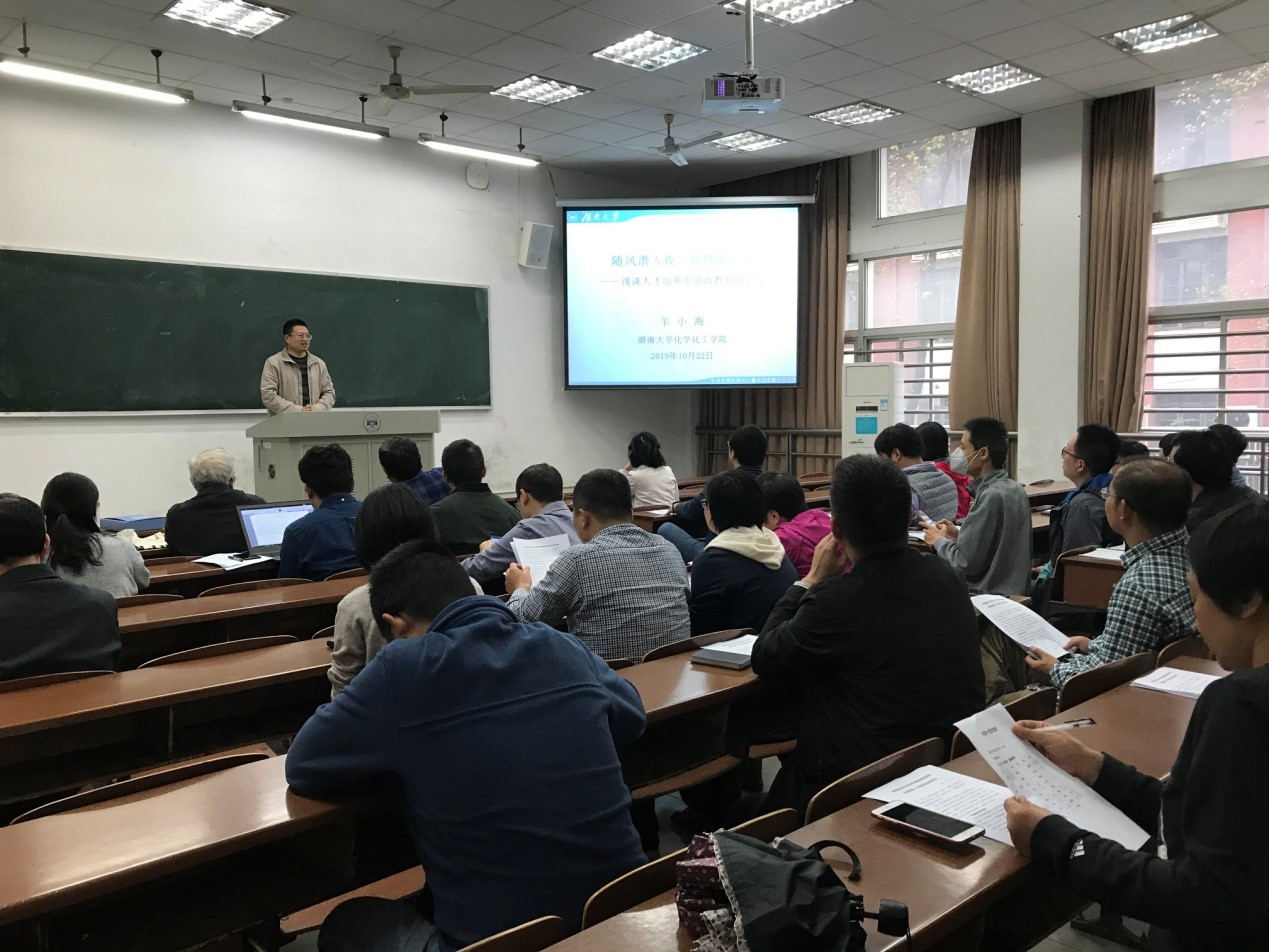 10月22日下午,化学系第一党支部组织无机、分析化学教职工开展集中政治学习活动,俞汝勤院士、王玉枝书记和聂舟副院长参加本次学习。化学生物传感与计量学国家重点实验室副主任羊小海教授作了“随风潜入夜、润物细无声——浅谈人才培养中思政教育的引入”的专题党课。他从中国共产党人的初心和使命,培养什么人、怎样培养人和为谁培养人的问题入手,提出尊重教育规律,创新教学手段,不喊口号、不翻本本,提炼文化基因、凸显...